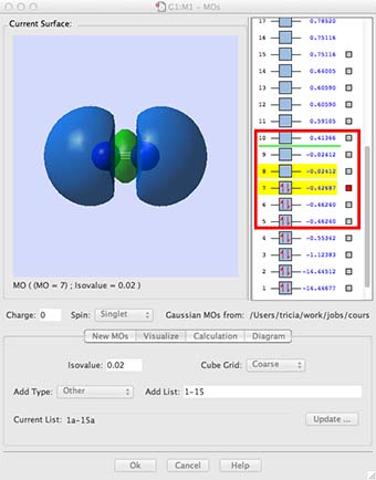 - A MO window should open. In the new window select the "Visualize" tab and then in the box "Add List" type "1-12", and click on Update. What will happen next is that gaussview will read information off the checkpoint file and covert this into the molecular orbitals 1-12 for you to visualise. Be patient, this requires quite a bit of number-crunching and may take upto 10min.