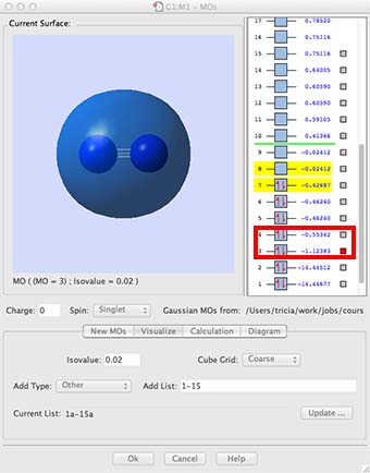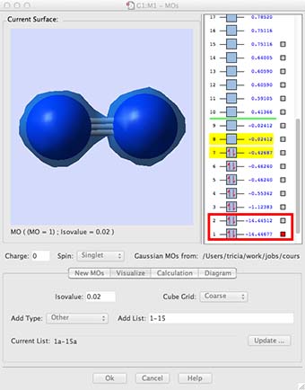 - Click on the box for the lowest energy MO, the MO is the blue shaded region on the diagram above. (you may have different preferences set so it may give a mesh or an opaque surface, if you want to change the representation go into the "preferences" menu and select surfaces.) It is easy to see how this MO is a bonding combination of the two 1s core AOs on each N-atom. The next MO up in energy is the antibonding combination of the two 1s AOs. Notice how deep in energy these MOs are, -14.44 au much deeper than the MOs formed from the valence shell AOs. These AOs hardly overlap at all, they are held tightly to the respective nuclei, they are not very involved with chemical bonding.