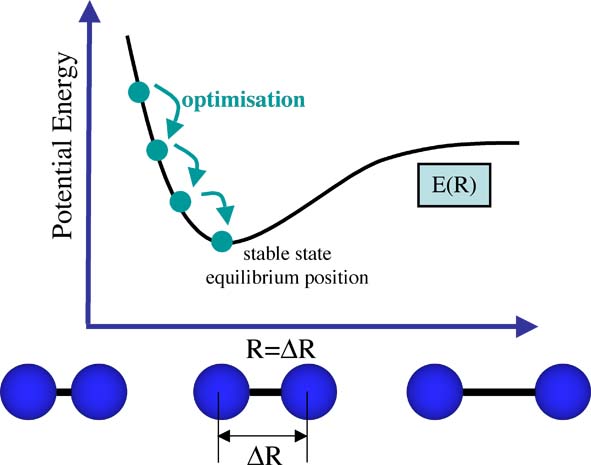 As the system moves there will be a sequence of different energies all dependent on the changing coordinates of the nuclei and electrons. We are traversing a Potential Energy Surface (PES), the potential energy surface E(R) for a diatomic has already been shown above. The process of optimization is shown in the figure below.