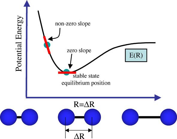 And at equilibrium (when we have zero forces) the slope of the graph is zero, see the figure below. This is also something you should know from your math courses. When the system is not in equilibrium the slope of the E(R) graph is not zero. Thus we now have a criteria for searching for the structure of a molecule, the structure we want is the one at which the first derivative of the PES is zero.
