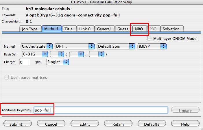 - open the .chk file from your optimisation of BH3 It is important to make sure the method is now set to energy and is NOT optimisation. Then include in the "additional keywords" section "pop=full", this switches on the MO analysis. And under the NBO tab select "Full NBO"