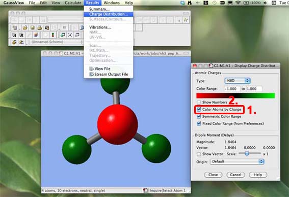 - on the panel that appears select NBO as the type and color the atoms by charge. Important: you must select the NBO charge distribution not the default Mulliken (which is a poor method for computing charge). Many students have forgen this and they have reported the wrong charges. Bright green indicates highly positive charge and bright red highly negative charge. As expected the nitrogen atom which is electronegative is highly negatively charged.