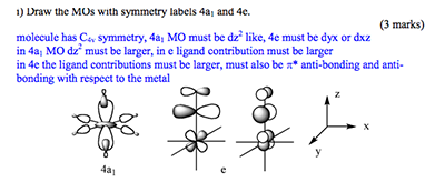 Q: I have a question about one of the exam questions. As illustrated below, the first question (i) was to draw the 4e and 4a1 orbitals. The 4e1 orbitals seem logical, and so does the 4a1 orbital, until I read in the answer key, which stated that the metal contribution to the 4a1 orbital was bigger than the ligand contribution. In normal circumstances I would follow the same reasoning, but due to the presence of the pi acceptor ligand (which is slightly higher in energy than the metal d orbitals), I was unsure as to why the metal contribution was higher to the MO than the ligand contribution.A: Careful, you need to look very carefully at the diagram, it tells you what to do and which ligand orbitals are involved. The 4a1 is an antibonding MO formed with the a1 ligand **sigma framework** and the dAOs, as this orbital is antibonding the higher lying fragment is the largest contributior and in this case it is the dAO. The sigma orbitals are almost always deeper than the dAOs, it is only the pi orbitals that come close to the dAOs in energy. The 4e MO is overall antibonding and so the highest energy FO contributes most, in this case it is the p(pi)antibonding FO of the ligand which is higher in energy than the dAOs.