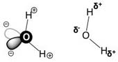 The diagram to the left shows the original picture of water and next to it is a new simplified depiction of water. The "bunny ears" of electron density are represented by the "delta minus" δ− near the O-atom, and the H-atoms now have δ+ meaning they are slightly positively charged. We use the delta symbol because this is not a whole unit of charge, but some amount less than this. We now reserve the plus or minus symbol inside a circle to represent a whole unit of charge, +1 or -1.