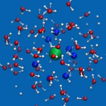 Snap-shot from a simulation showing 3d structure of water molecules (red and white) around a Cl anion (green), the "blue" O-atoms belong to water molecules directly interacting with Cl anion.