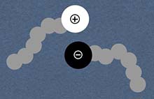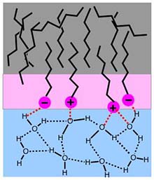 Representation of surfactant molecules. Grey represents neutral, black negatively charged and white positively charged parts of the molecule.