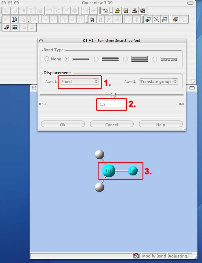 - Then we want to make the bond longer, enter 1.5 in the text box (2.), you will see the chosen bond elongate (3.) Then press the "OK" button, if you don't press ok the change will not be effected.