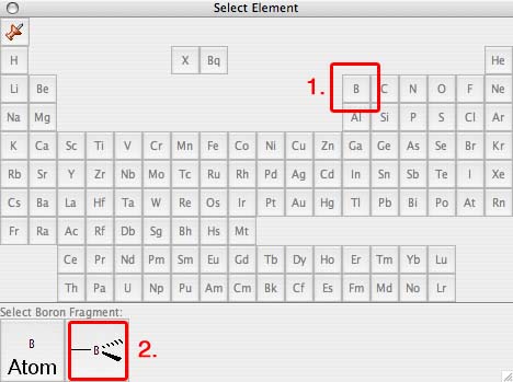 - when the periodic table comes up choose B for boron (1.), then when the boron options appear along the bottom of this window choose the planar fragment (2.):